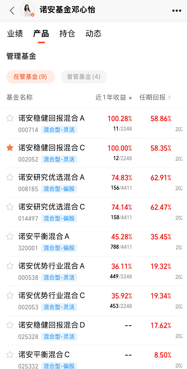 天天基金数据显示,邓心怡目前在管的9只基金,无论是近1年收益还是任期回报,全部实现正收益!具体来看: