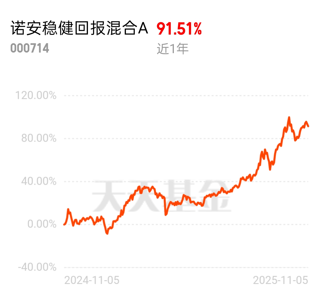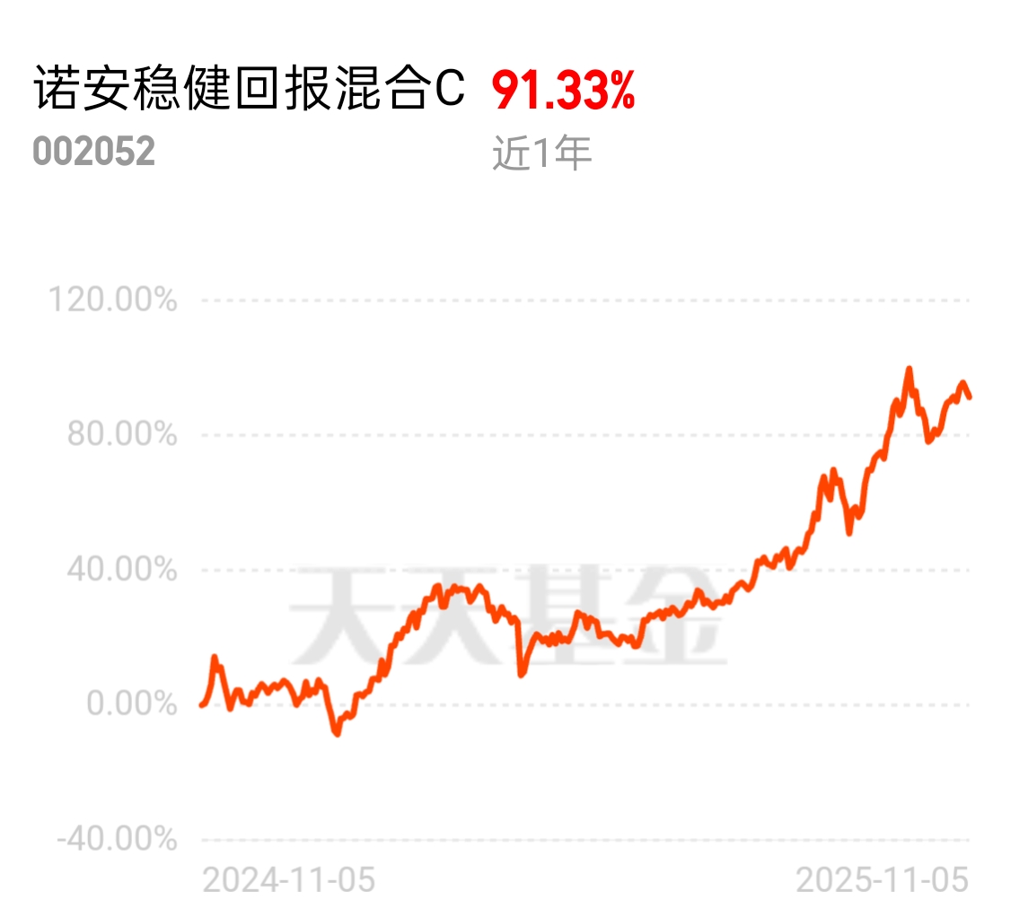 诺安稳健回报(基金代码:002052)成立于2015年11月,截至2025年9月30日规模达10.75亿元。近一年基金累计收益为91.33%,近两年累计收益率128.36%,分别超越同类基金平均水平70个、100个百分点。