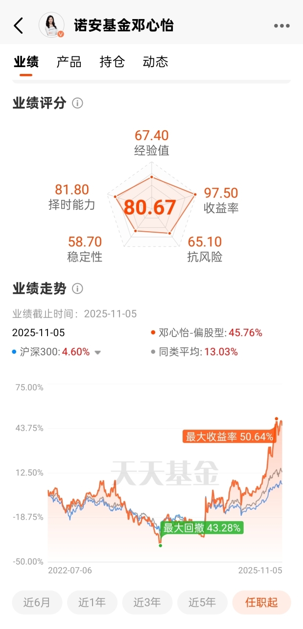 诺安稳健回报的亮眼表现,核心源于基金经理邓心怡的专业把控。作为硕士学历、近10年投研经验的资深从业者,她2020年11月加入诺安基金,从研究部副总经理逐步成长为权益投资事业部副总经理兼研究部总经理,全面主导科技领域投研体系搭建。