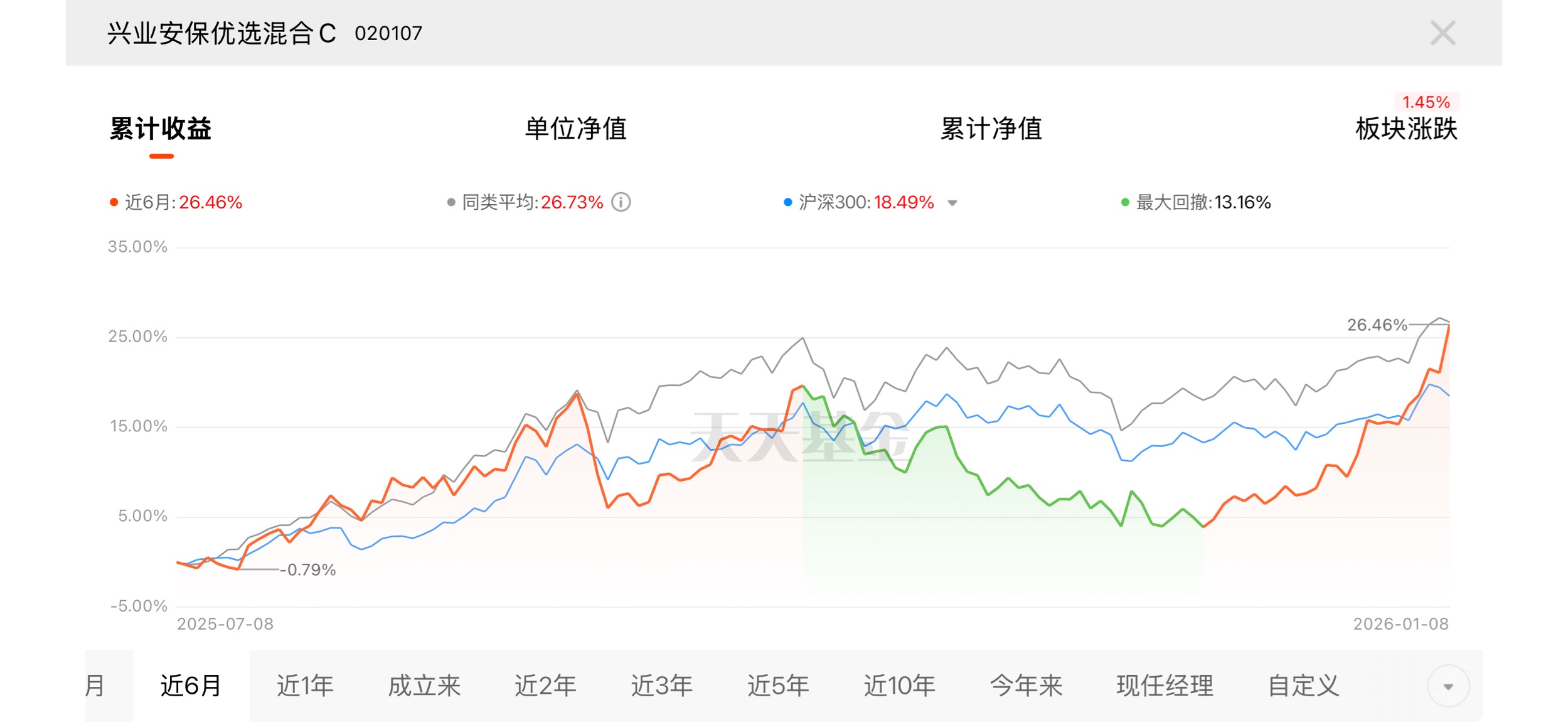 开年股市连阳突破 4000 点,债市却遇寒流,567 亿资金从债券 ETF 流出。对比之下,军工 + 商业航天卫星赛道爆发力十足,$兴业安保优选混合C$ 近 6 月 26.46%,昨天净值比不少基金都强,趁行情好赶紧入手。