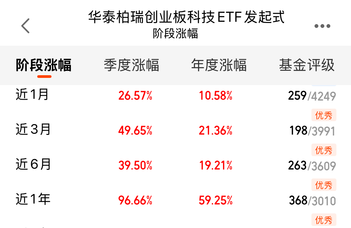 强者恒强!考虑到对美模拟芯片的限制以及固态电池概念的持续发酵,创业板科技指数或进一步走强攀升,我今天也顺势右侧追加了一份华泰柏瑞创业板科技ETF发起式联接C,产品紧跟创科技指数,近1年大涨96.66%,持有7天免赎回费,也可以灵活抓波段。
