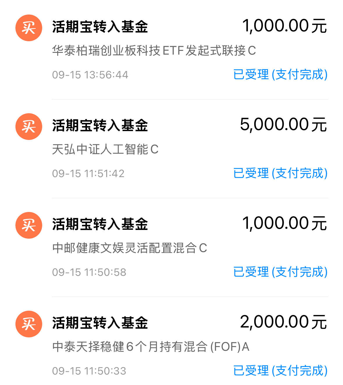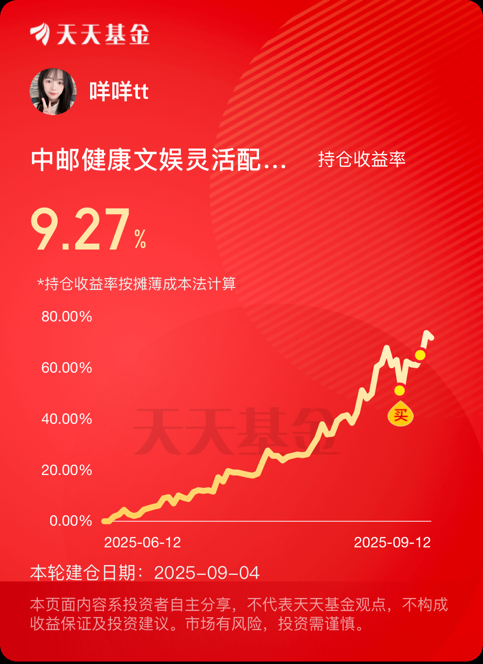 电池起飞!科技、电池双主线轮动行情,咩咩紧跟主线龙头,顺应大势。行情没有结束之前,热点切换也将带动大盘呈螺旋式上涨,只要结构依旧强势,我也会果断出手。我继续加1000元 $中邮健康文娱灵活配置混合C(OTCFUND|022252)$