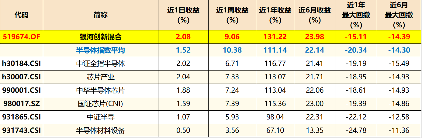 3连涨,银河创新成长今天3连涨基本稳了,我看了前十权重有2个涨幅超10%,所以问题不大。消息上,半导体国产替代再迎催化剂,我就说吧,半导体这块就是抛开AI提振需求,自主可控这个逻辑也是会反复强化的,所以投半导体我基本不会担心会被埋。银河创新成长算是主动型半导体主题基中的佼佼者了,A类份额近1年涨幅超130%,大幅跑赢相关半导体指数的同时回撤也控制的更优一些。