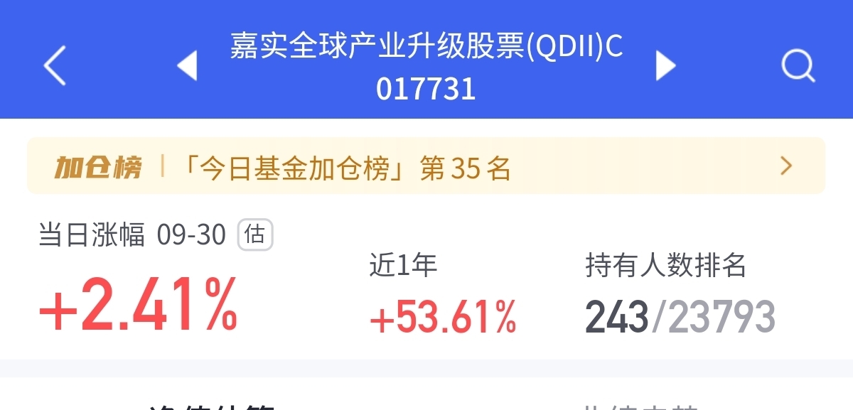 节后首个交易日,市场迎来“开门红”行情,其中科技板块表现尤为亮眼,成为带动盘面走高的重要力量。在科技主线持续发酵的背景下,我看$嘉实全球产业升级股票(QDII)C$ 表现不错,近一年斩获53.61%的涨幅,在同类QDII产品中处于前列,继续看好了接下来的行情!