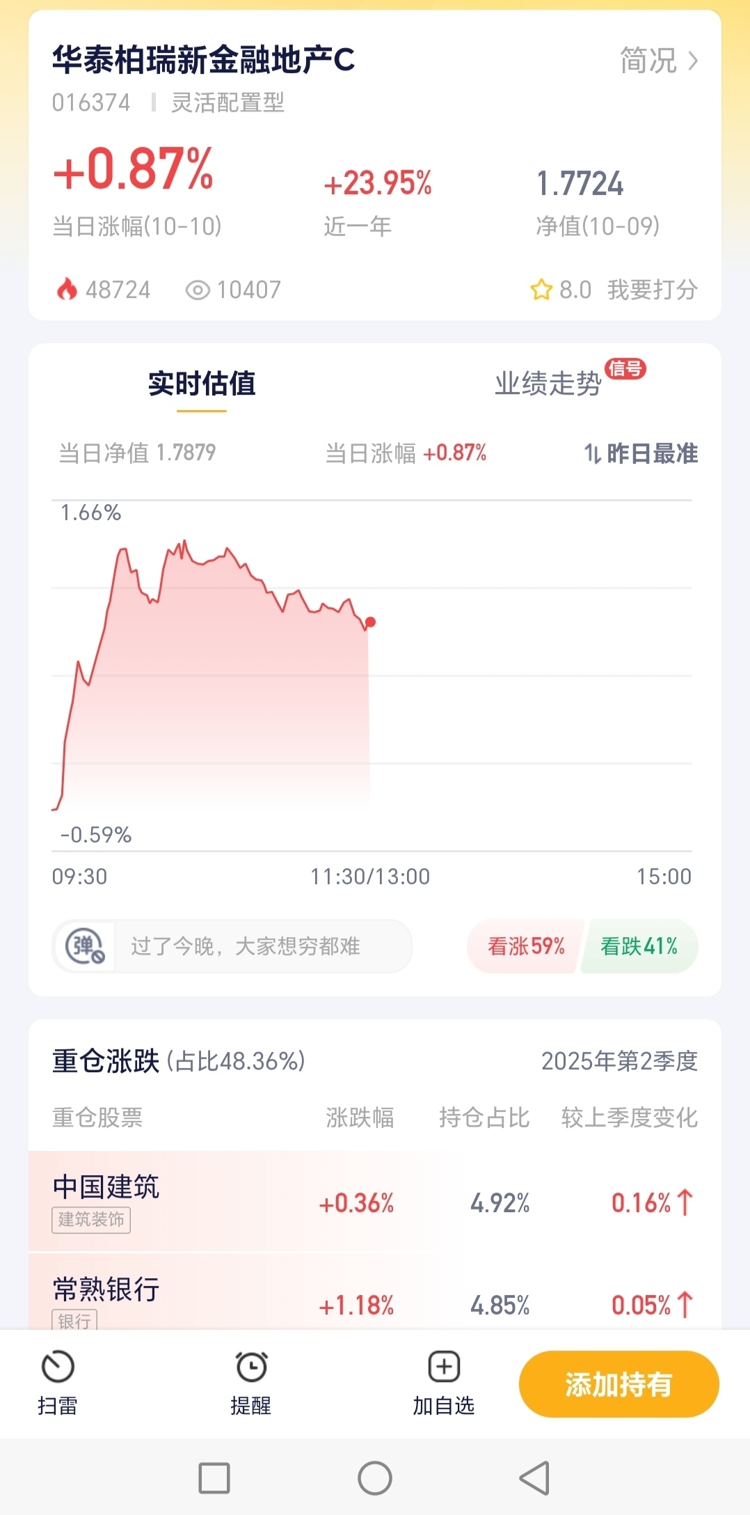 今天市场震荡,科技主线回调,咱投资得讲究个搭配。华泰柏瑞当日涨0.87%,近一年涨23.95%,表现挺亮眼。它聚焦金融地产,中长期收益很给力,是灵活配置型,适合顺周期布局。看它重仓的中国建筑、常熟银行今天都在涨,持仓很扎实。要是你想给持仓加些稳健的“分量”,华泰柏瑞这只基可以放进观察列表,说不定能成为你投资里的“稳定器”。$华泰柏瑞新金融地产混合C$ #分享国庆见闻,晒收益,瓜分好礼!#