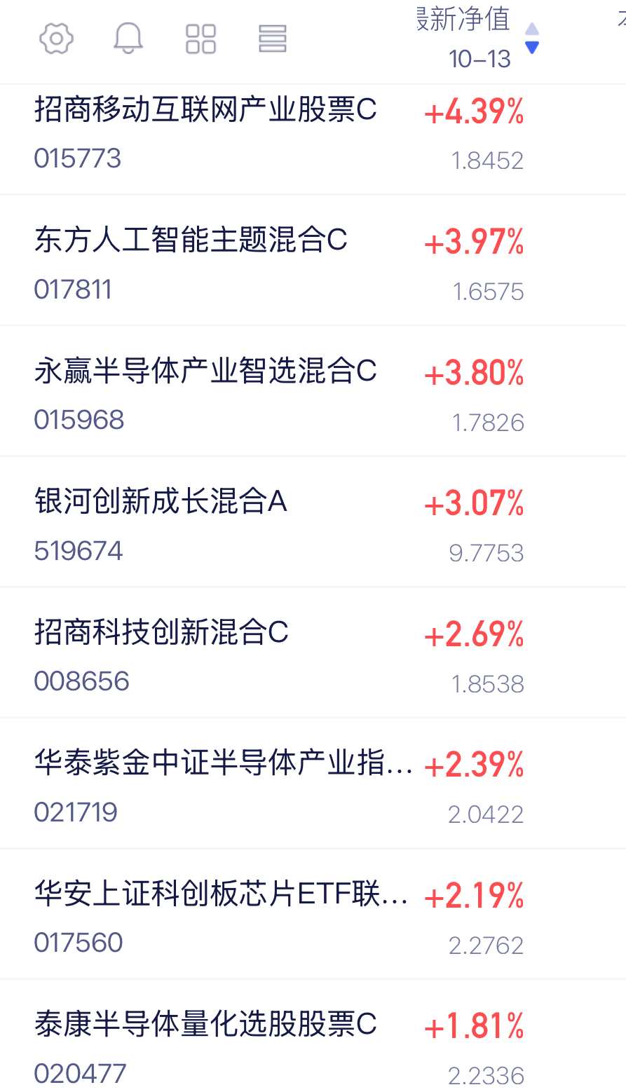 以为昨天要吃大面,没想到半导体不赖啊,带动了科技率先反弹$招商移动互联网产业股票基金C$ 昨日打仗4.39%,过去一周涨幅了3.07%手上的收益也突破了55个点了,这就是主动管理基的优势,经理根据行情及时动态调股不仅能精准跟上行情,也能躲过回调。想想也是,近半年58.18%,没两把刷子也很难做到。