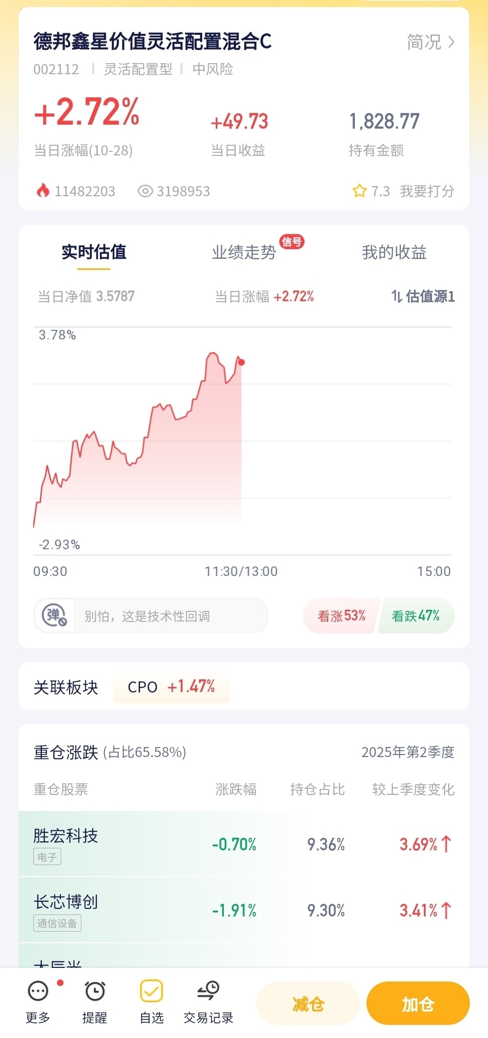德邦鑫星价值灵活配置混合今日预估涨幅+2.72%!