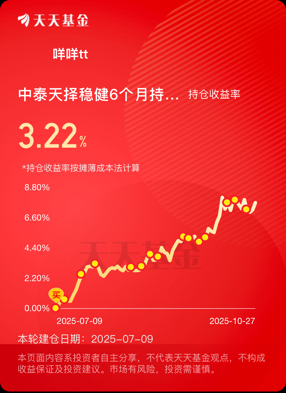 美股、黄金等受益于降息周期的资产我也会继续配置,中泰天择稳健6个月我今天又加了2000进来。超稳的一只多元化配置产品,除了投美股、黄金外,还有美债、国内债、港股等资产,投的分散但不乱,策略稳中有进,近1年涨幅15.2%,最大回撤3.06%,闲钱理财或是做压舱石配置都挺不错的。