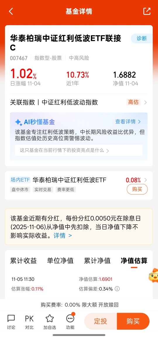 今年的市场真是考验心态,一会儿上一会儿下,尤其是到了四季度,资金面紧,板块轮动又快,想保住收益太难了。不过还好有红利低波板块撑着,毕竟现在利率下行,这种高股息的资产吸引力越来越强,比存银行划算多了,还能抗波动 。要是想布局这个方向,华泰柏瑞绝对是优选,它跟踪的指数都是经营稳健的龙头公司,连续好多个月都分红,C类持有久了赎回还不要钱,太适合想稳一稳的普通人了 。