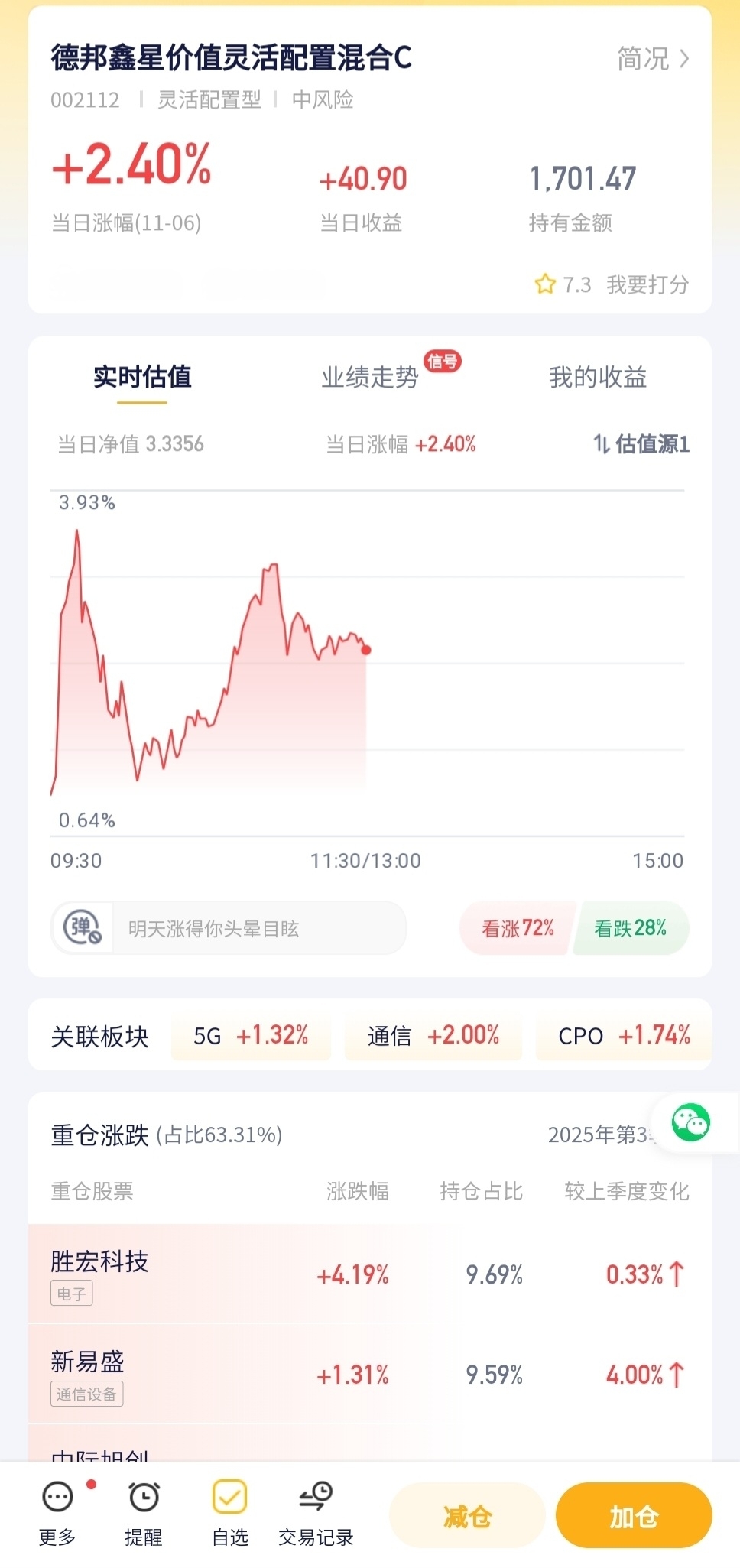 德邦鑫星今天涨了2.4个点,价值灵活配置的基金在今天行情里表现不错,看来市场对这类灵活配置的基金认可度挺高,拿着的朋友应该很开心。
