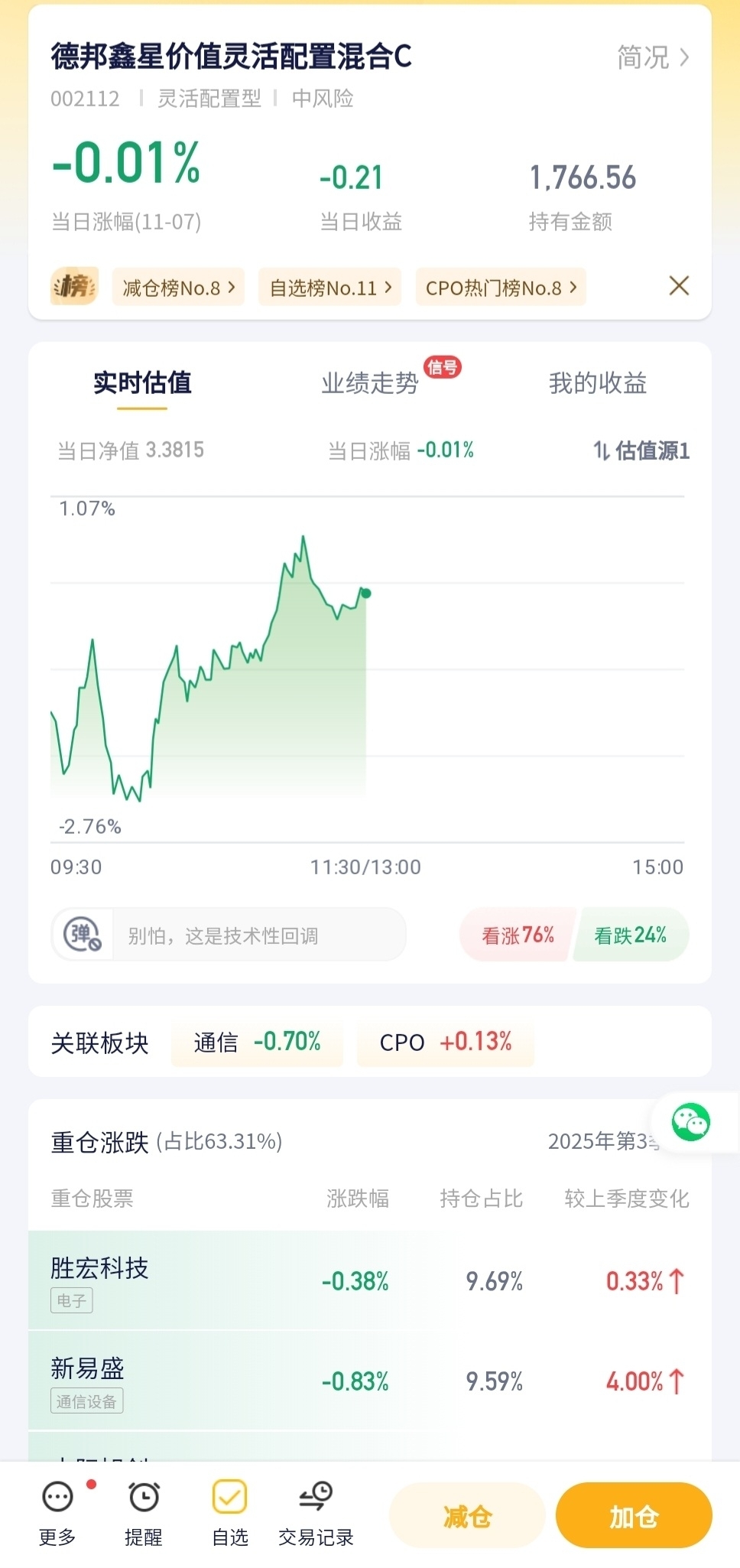 德邦这只基金今天微跌0.01%,几乎可以忽略不计,价值板块今天没什么大动静,资金也没怎么动,所以它就稍微跌了一点点,基本等于没变化。