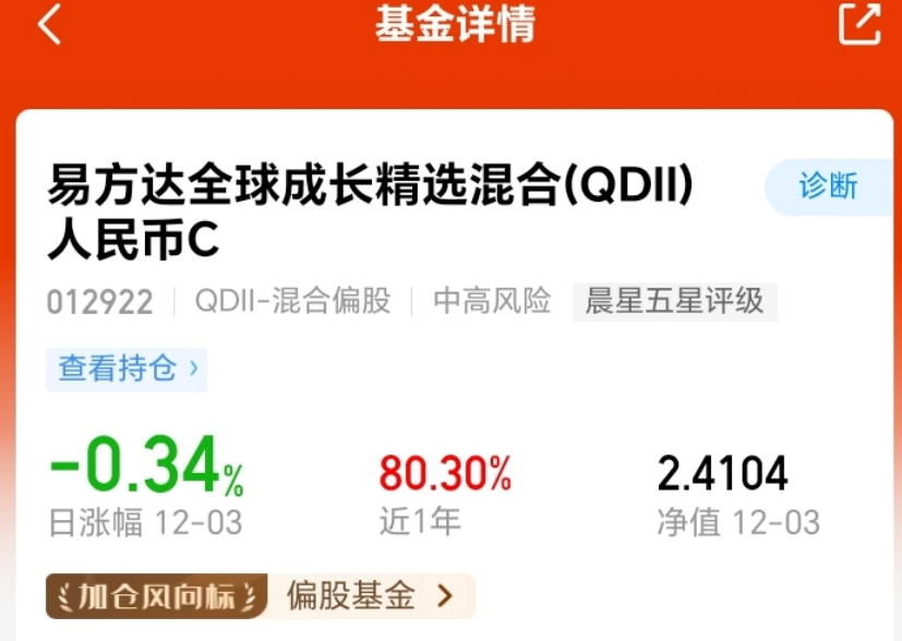 $易方达全球成长精选混合(QDII)人民币C(OTCFUND|012922)$横跨A股港股和美股三大市场布局龙头科技。近期科技调整中回撤控制不错,近一年还涨80.3%,基金经理调仓的能力不错,长期拿着又省心又踏实,持仓体验拉满~