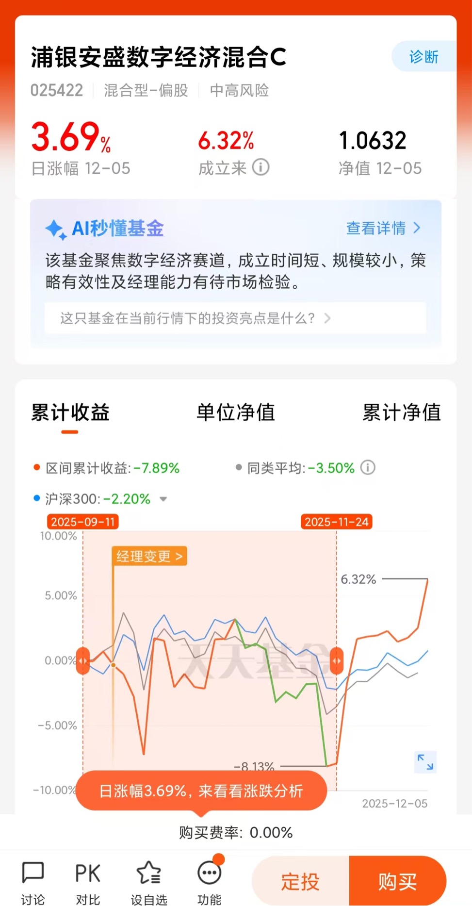 浦银安盛数字经济单日大涨3.69%,看了下基金经理李凡虽然年轻,但是深耕通信板块