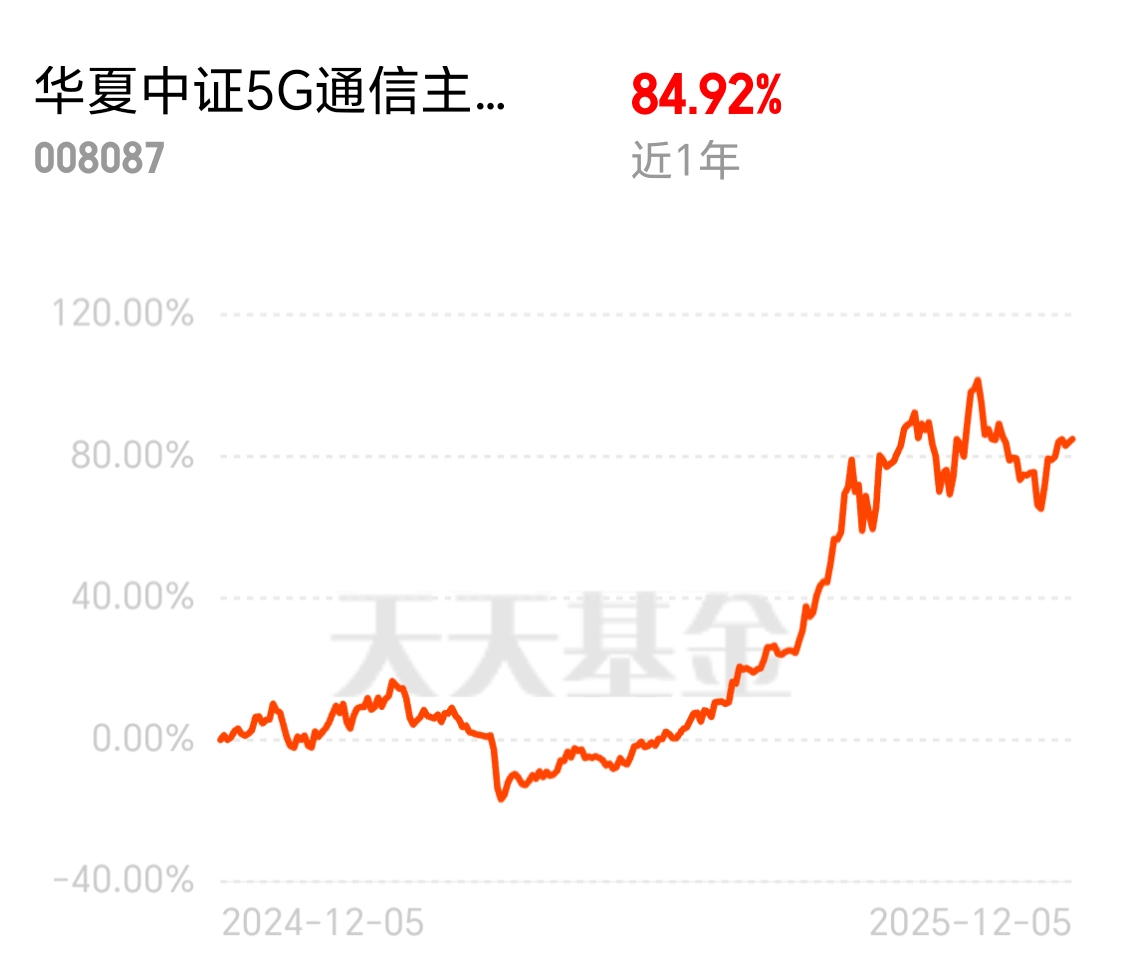 近一年收益84.92%,当前强势上涨4%,叠加5G板块通信当前上涨态势良好,长期布局$华夏中证5G通信主题ETF联接C$的信心更加坚定了