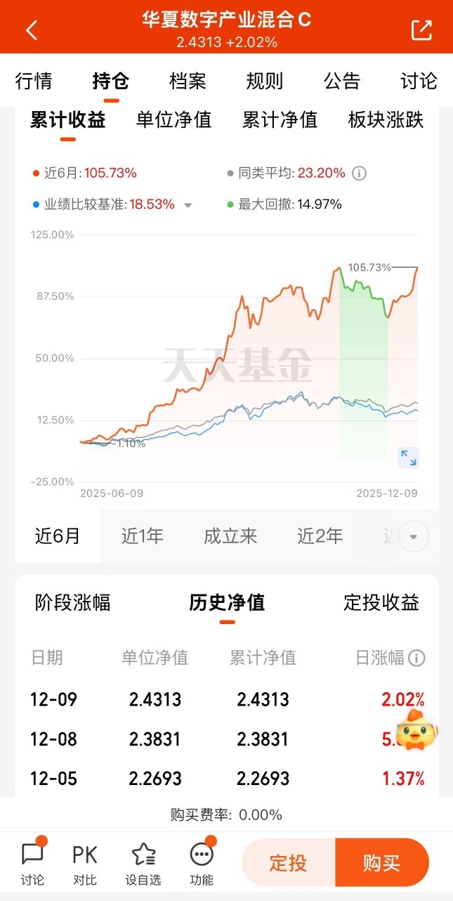 连续红五天的$华夏数字产业混合C$终于调整了,这回可不能错过加仓机会,这基近一周