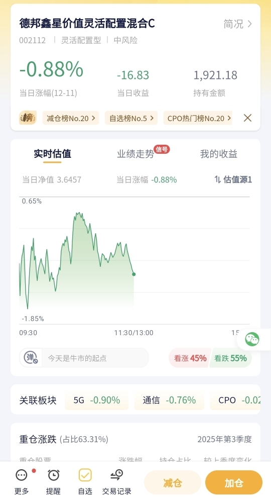 这只灵活配置基金今天跌了0.88%,看它持仓的价值股方向今天整体走弱,不管是金融还是周期类的价值标的,都没顶住市场的调整,基金跌幅也比多数基金大些。