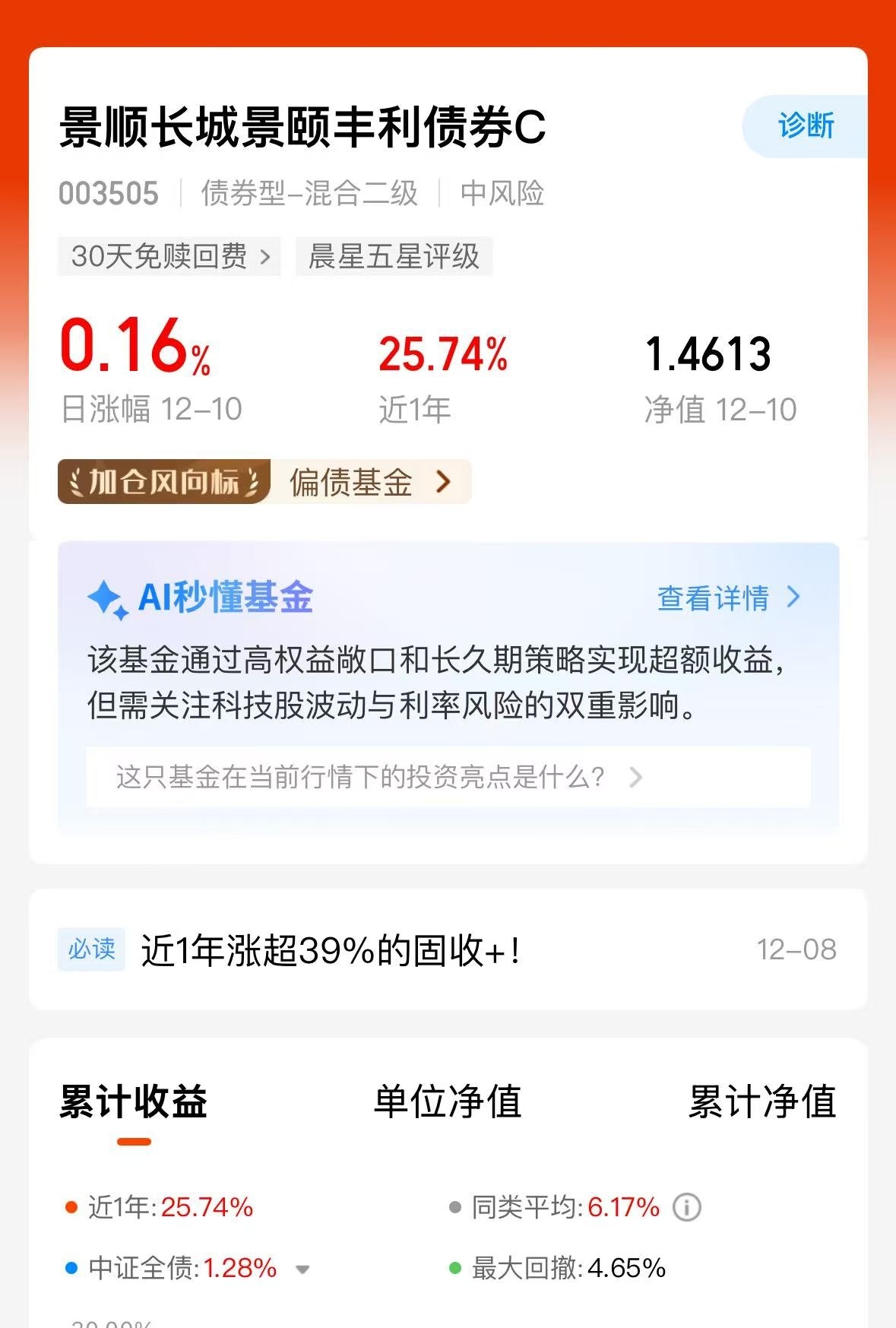 #【跨年坦白局】提问金梓才、陈果# 看了眼自己账户,全是高波动的股基,年底心里有点慌,而景颐丰利含科技的混债基,反弹大、修复快,近一年收益25%,回撤小收蛋还多$景顺长城景颐丰利债券C$