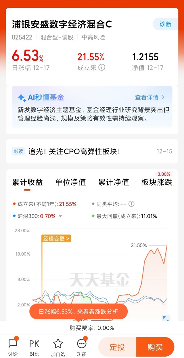 #锂价狂飙!能源金属归来?# CPO新晋卷王浦银安盛数字经济大涨6.53%,这个大涨的表现已经证明基金经理的能力了,下面就看自己能不能拿住了$浦银安盛数字经济混合C$