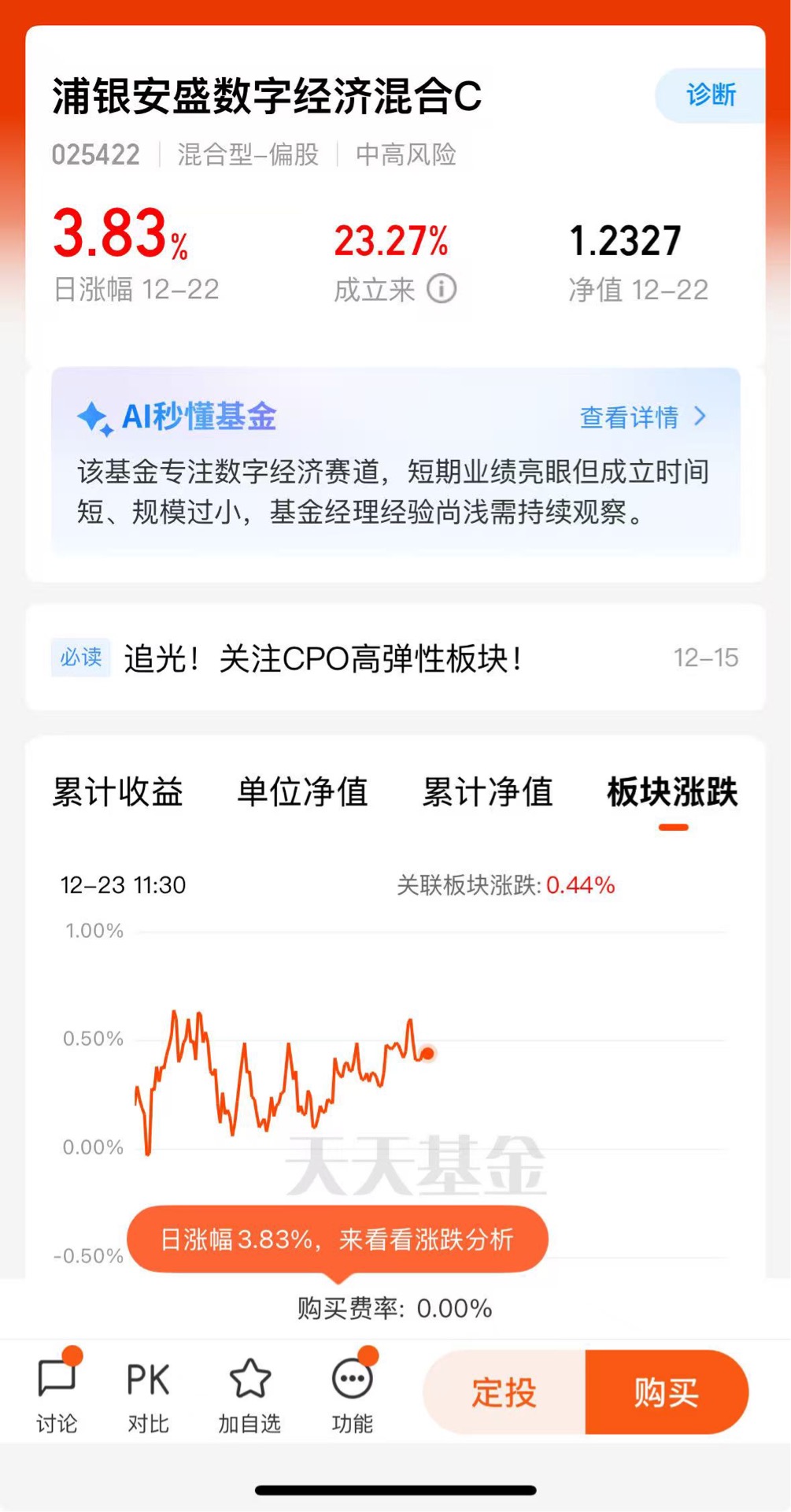 $浦银安盛数字经济混合C$ 昨天涨了3.83%,新基金规模小压力小干的猛后起之秀不可小觑