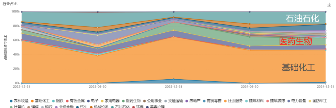在行业配置上,赵森将自己在化工行业的研究优势发挥到了极致,以『基础化工+石油石化+化学制药』为主,跟随行业周期变化动态调整比例。(2022Q4至2024Q4,数据来源:Wind)