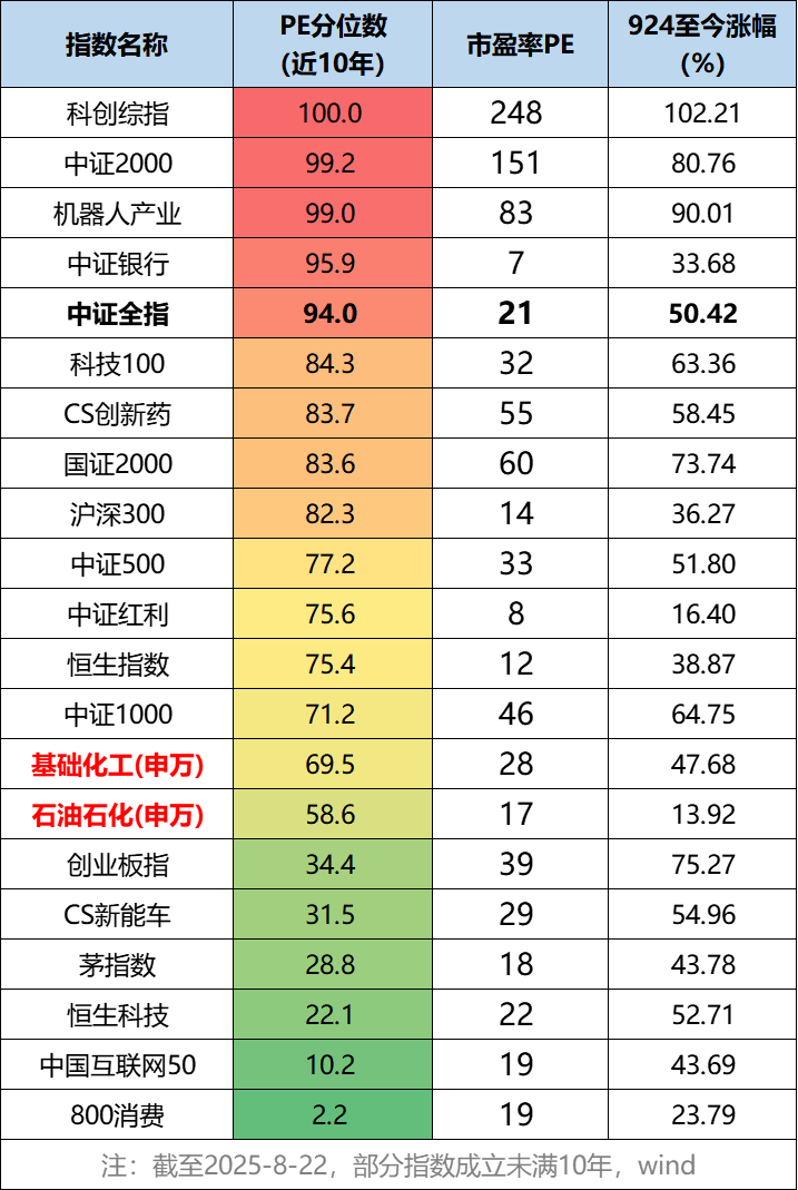 下表列举了部分行业和板块当前的估值分位数,冷热差异很大