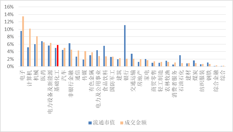 下图为31个申万一级行业的市值占比和成交额占比,基础化工位居前列,甚至超过汽车、通信、食品饮料,我估计这是很多投资者都没想到的。