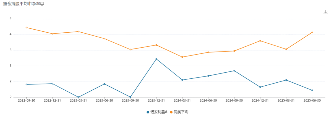 估值方面,从历史持仓的加权平均市净率来看(周期性行业适合看市净率),他的持仓PB平均在1.97,低于同类基金3.25的平均水平,偏好低估值的股票。(2022Q3至2025Q2,数据来源:Wind)