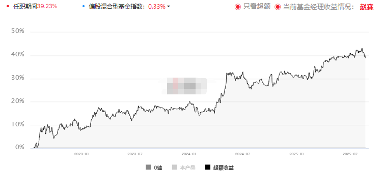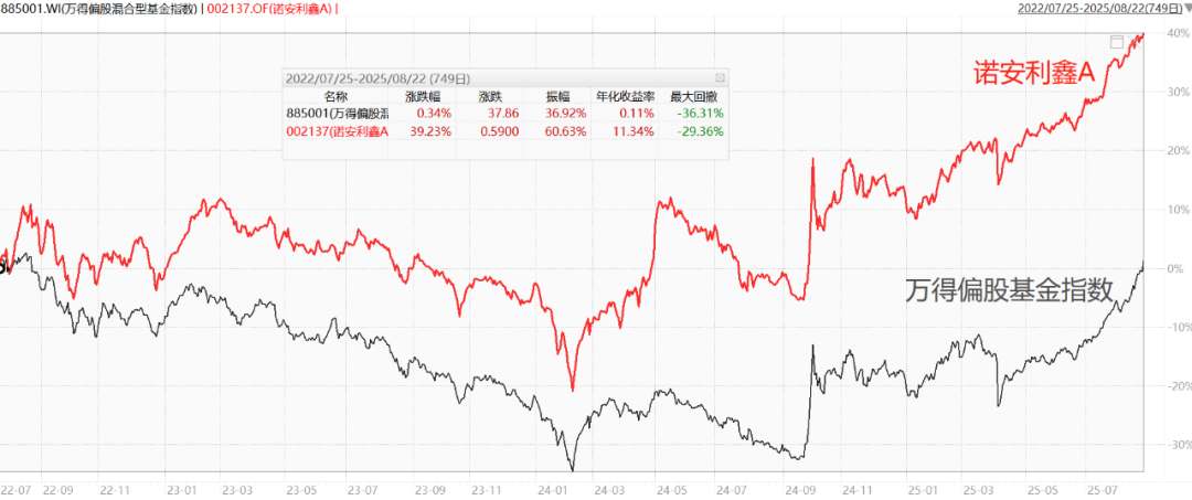 代表作是诺安利鑫A,虽然接任时面临熊市,但赵森大部分时间维持住了正收益,并且在反弹中表现出色,任职以来收益率为39.23%,大幅跑赢了万得偏股基金指数,同期排名市场前5%。(2022-07-25至2025-8-22,数据来源:Wind)