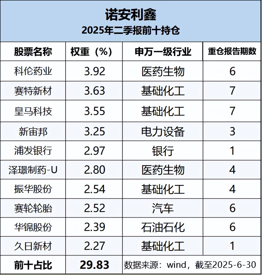 可以看看下表2025Q2的前十持仓,许多选股都有一定的原创性。呈现出小市值特征,前十平均市值约为624亿,行业偏向基础化工,个股非常分散。(数据来源:Wind,截至2025.6.30)