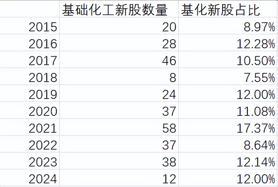 但其实化工是一个大行业,A股相关上市公司(基化&石化)超500家,市值占比超过5%,成交额占比超过6%,有子行业近40个,细分子行业上百个,新股占比常年超10%,投资机会其实是非常多的。