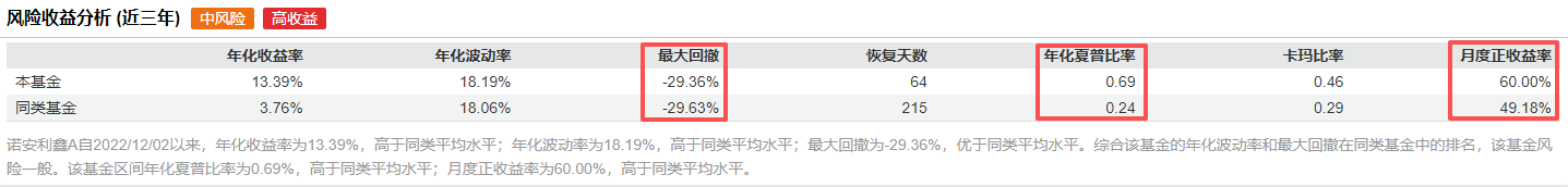 Wind数据显示,截至2025年12月1日,诺安利鑫近三年年化收益13.39%,区间最大回撤-29.36%,年化夏普比率0.69,月度正收益概率60%,这几组数据均要优于同期的同类型基金。