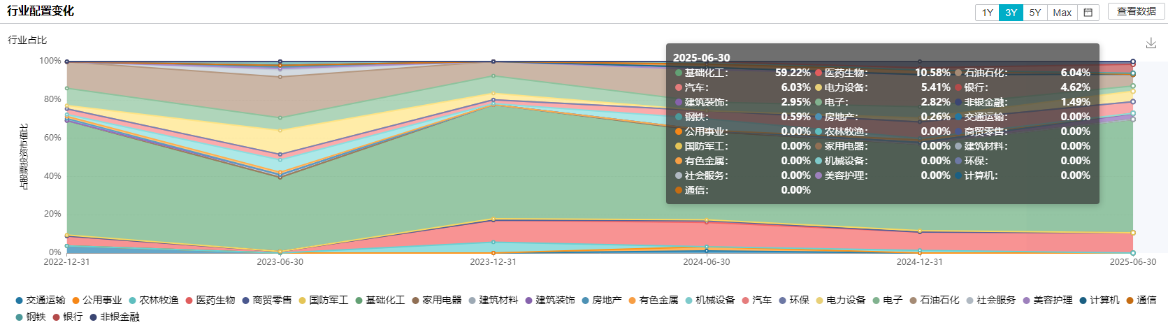 所以,在行业配置上,重仓了化工板块,根据申万一级行业分类,这只基金在今年中报的基础化工行业占比将近60%,较好地捕捉到了本轮化工的行情。