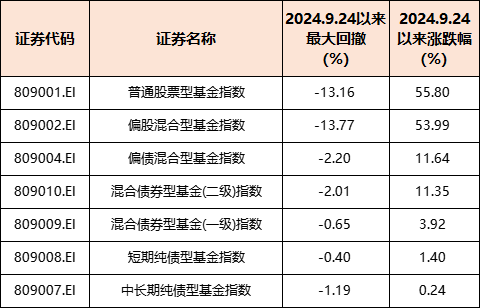 自2024年9月24日以来权益市场情绪得到提振,带动普通股票型基金指数、偏股混合型基金指数区间涨幅都在50%以上,而像偏债混合型基金指数、混合债券型基金(二级/一级)指数等有一定“含权”比例的收益率也高于纯债类基金指数。