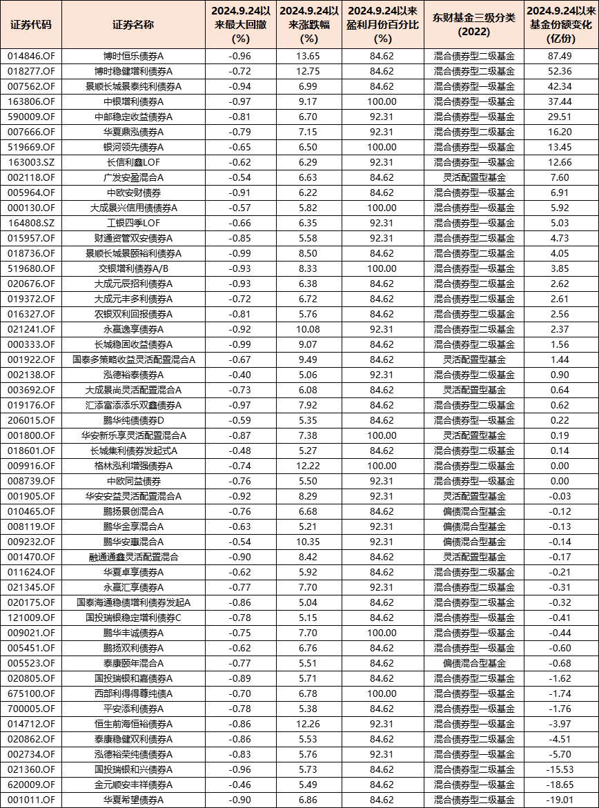 筛选全市场采用“固收+”策略运作的主动管理型基金,能够同时满足收益、回撤和胜率三大标准(2024/9/24以来最大回撤≤1%,同时收益率≥5%,且区间盈利月份占比≥80%),共有50只(只含主代码)。