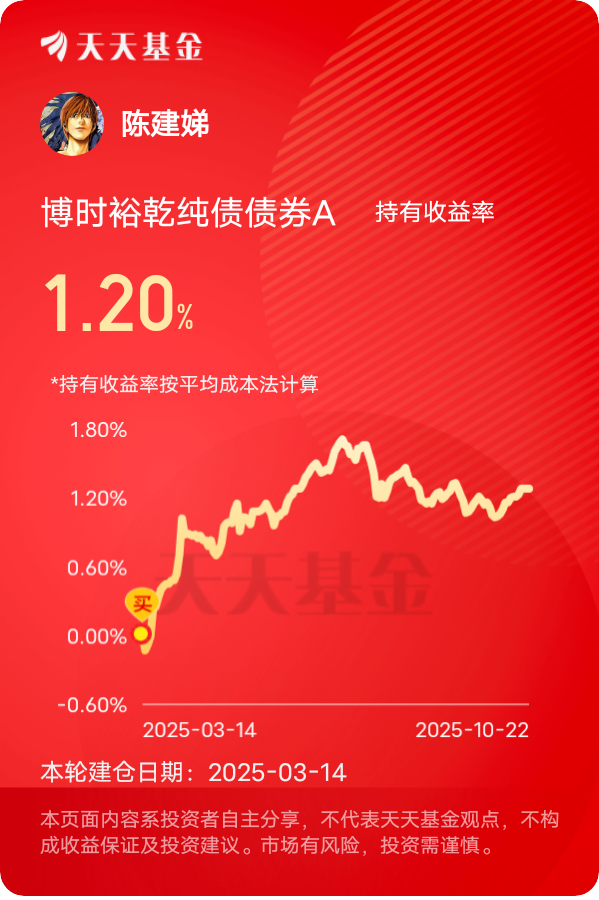 债市行情配合,裕乾纯债和博时稳健增利双双发力,左手利息右手增强,收益一次看俩,美滋滋~#晒收益#