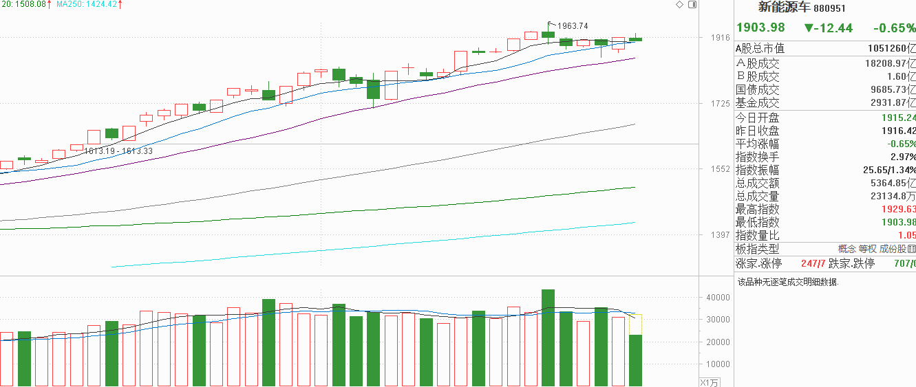 家人们,新能源车昨天上演了一出好戏!低开在10天线下方走高小阳反弹就收复了周二的探底回升小阴线并站在5天线上方,今天5天线还是走平,新能源车窄幅震荡也没有继续走高,感觉还是在整体蓄势。当下新能源车的震荡基于9月11号中阳线上方的区间震荡,重心还是上移的,机构风格很浓。说到机构风格,新能源车一直沿着5天线缓慢上移,期间每一次回调至5天线或10天线都有相对力度的阳线反包修复,可站上5天线上方后就是一种无序的表现,有时候会回落等待5天线上移,有时候会突然走高抬升重心,反倒是抛压一直没有出现。既然这样,我认为顺势而为就是最好的,因为主力控盘水平很高,要想在这种高控盘的板块中做价差并不容易,只要趋势还在,我会继续看好新能源车。