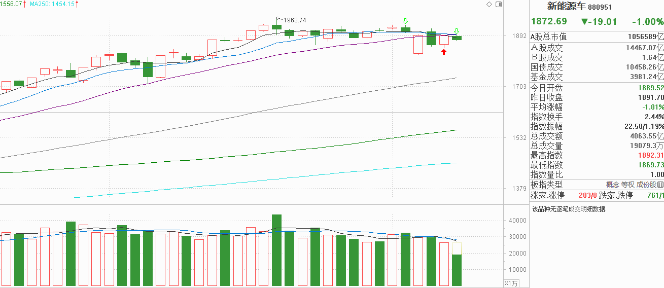 家人们,今天必须给大家讲透一个让人头疼的——新能源车!昨天探底回升反抽20天线,勉强守住9月横向震荡的箱底,但今天又是窄幅震荡,没有继续表现,感觉资金是只托不攻,不打破平衡的话,我觉得大概率还是横向震荡,不会出现方向选择。往大了说,新能源车当前震荡基于9月5号大阳线上方的震荡,可是节后市场抛压明显加大,新能源车的做多动力看起来是不足的,维持箱体震荡可以,但以这种状态选择突破就很难,而做价差得有波动空间才行,新能源车自9月12号后的波动就很少,短线资金只关注固态电池,并没有把热点扩展至新能源车,基于这样的资金分歧,我认为必须等待资金的表态,如果是持续流入的话继续看好,重新选择流出的话就要离场回避风险,不涨不跌只有观望了。