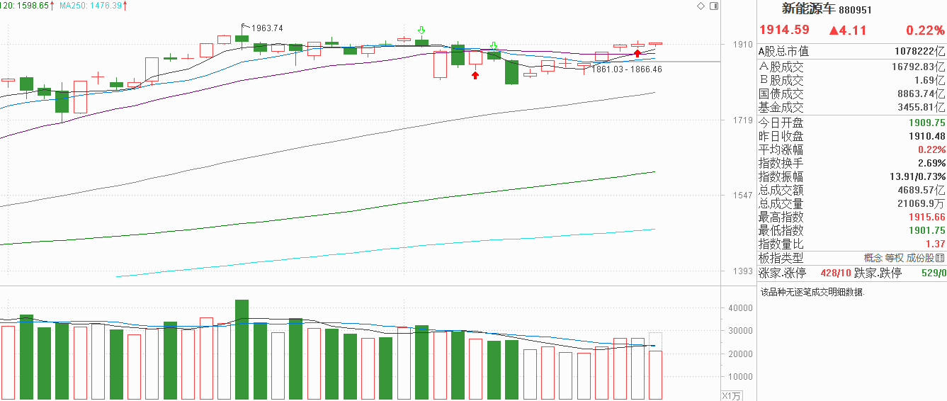 我的天呐!老铁们!看看新能源车这几天是什么样子!昨天窄幅震荡,今天也是窄幅震荡,5天线上穿20天线后并没有对新能源车构成上涨助力,是主力没有流向新能源车的原因吗?我觉得也不是,今天新能源行业涨势不差,固态电池表现很强,但对新能源车来说,表现为一个十字星,说明整体大板块还是多空平衡,资金流向了固态电池,就是场内资金博弈的结果。对于这种情况,我认为主力的控盘水平太高了,固态电池不就是新能源的权重吗?权重都涨起来了整个指数依然维持着平衡不动,那么将来固态电池出现抛压的时候,新能源车也能稳定不变。这对短线资金来说很不友好,但新能源车当前还是上升走势,已经在9月至今横盘了2个月,没有抛压的话只要多空平衡再次被打破,或者固态电池补涨到新能源车方向,也会带动新能源车继续上行,虽然现在没有上涨,不代表下个月不涨,还是耐心一点,等待轮动机会就行。