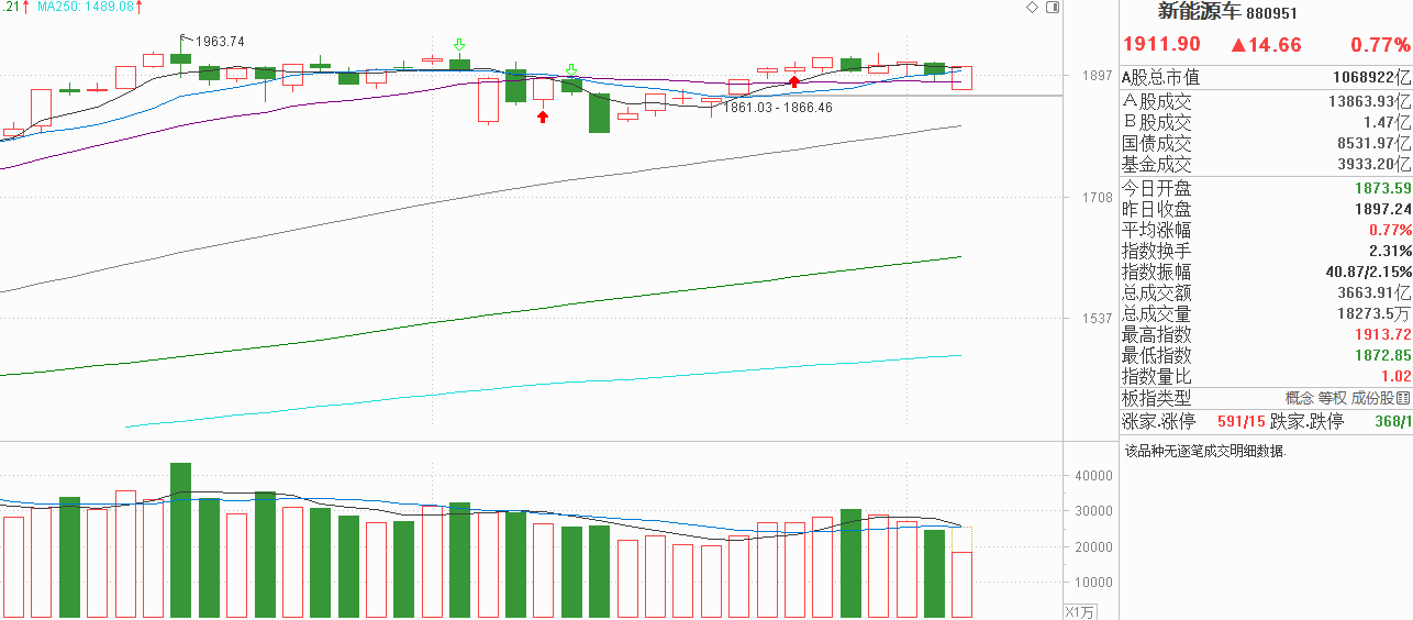 新能源车的朋友们,昨天可真是个煎熬的日子!小阴调整回到20天线后回升收在10天线上方,由于周一也是探底回升,我觉得主力还在,但并不是主动进攻,一直维持在箱顶附近,感觉在等一个突破信号。今天新能源车大幅低开在20天线下方,结果低开高走再次回到5天线上方,又是更大有承接力度,但要说资金的攻击性,我觉得是欠缺的。对于一个已经在高位横盘两个月新能源车来说,如果久盘不跌,反过来的逻辑是突破后是一波流,只为横有多长,竖有多高,至于什么时候出现突破,目前当然是看不出来的,资金还在暗处。至于每一次探底回升是主力在吸筹更是难猜,不过新能源车要突破的话,中阳反弹是跑不了的,如果发现新能源车出现异动,就要马上跟上主力一起看好。