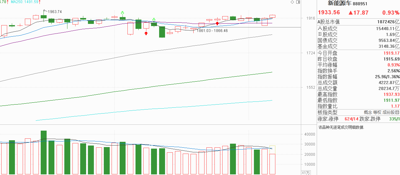 新能源车的朋友们,昨天你们是不是也看到希望了?低开高小阳反弹把周二的阴线反包了,今天探底5天线后回升继续走高,离9月18号的上影线高点并不远,属于震荡箱体的箱顶位置,但近期新能源车的抛压并不大,每一次回调都能圆回来,我认为这么窄幅的区间内箱体震荡的规律可能会失效,还是以资金流入的动向来观察可能靠谱些。对于新能源车,目前是有资金在流入的,但流入力度并不大,全是小阳为主,但这些小阳又有持续性,与连续有力度中阳反弹有差别,我认为不属于突破信号,但也不是遇上阻力。新能源车更像是贴着9月阻力不断上行,通过时间换空间产生质变效果。对于这种奇怪的走势,我认为保持定力不看多也不看空会好一些,那一天主力真要向上突破就跟随看好,没有表现出积极信号就继续躺平,反正新能源车现在就是躺平的状态。