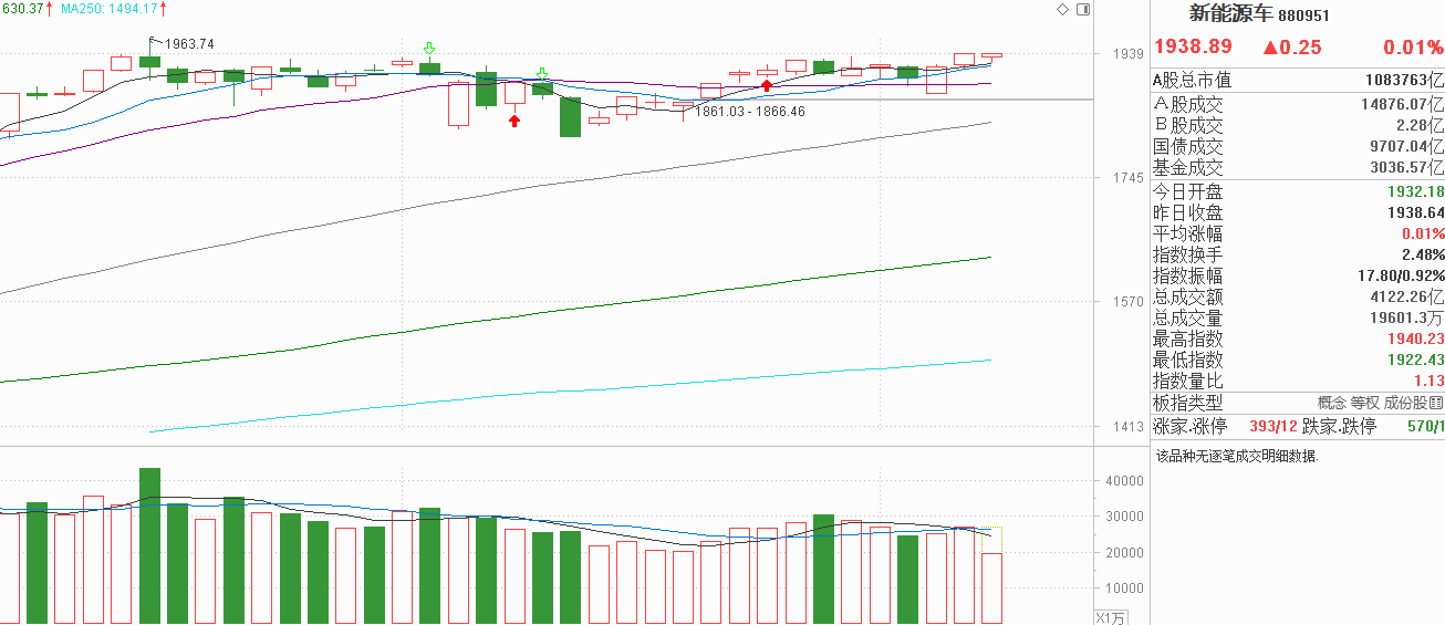 新能源车的朋友们,昨天看着没看着?小阳反弹继续上行,今天低开探底5天线后回升,下影线代表承接力较强,在震荡市中通常意味着下一周期会向上测试阻力。新能源车在9月箱体内已经震荡了两个月,现在又位于箱顶附近,这个位置承接力足够强,不排除在向上测试阻力的时候选择突破开启新周期。假如下一周期向上测试阻力失败,新能源车也只是回到5天线甚至20天线的位置再获支撑,向下空间还是有限的,在这个基础上,虽然在箱顶附近如果真要做选择,我觉得现在没有出现资金流入是多空平衡的表现,抛压不大,突破还是有可能的,风险与收益比偏向多头,所以我会继续看好。