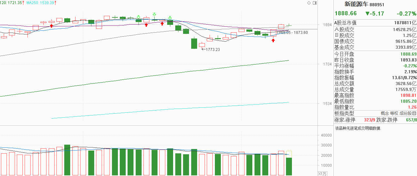 我的天哪!各位新能源车的铁子们,昨天小阳反弹收复60天线,连续两天小阳反弹力度不大,反弹也只回到10月震荡平台附近,如果没有持续有力度的资金流入中阳突破平台,大概率就是维持原有平台的震荡行情,如果市场抛压出现,甚至这种反弹只是弱反抽而已。今天新能源车窄幅震荡,位置还在60天线上方,感觉上方的抛压不大,但也没有更多的资金流入,维持原有平台震荡是大概率情况。此前新能源车一直就是这样震荡,机构控盘风格明显,今天没有看到明显的回少,说明带动这次上行的资金也是机构,只有这样,买盘与抛压都是同步的没有冲突,散户的流出是完全能防住了。当然这样震荡也不是办法,没有突破就更不容易吸引新增资金的流入了。我认为新能源车当前没有被平台压制的风险,但也没有向上突破的内生动力,继续无序震荡或许是大概率了。