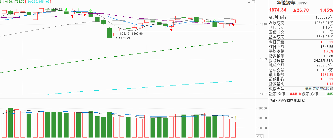 新能源车昨天低开高走至10天线后冲高回落,由于新能源车上方有9-11月的箱顶,在10天线就回落明显是提前遇上阻力了,按正常震荡市规律,今天应该向下探找支撑。但新能源车今天高开高走中阳反弹直接反抽60天线,走势比预期明显要强。我觉得一点都不奇怪,只是前期资金太悲观完全忽略了市场基本面的表现,近期碳酸锂期货已经创新高了,较11月份涨了不少,这个基本面新能源车感觉今天主力才回来了,回到60天线我觉得很正常。现在新能源车又回到9-11月的阻力区,很明显就得看持续性了,今天新能源车有资金流入,不代表能持续,像12月5号那样第二天只是小阳反弹,最终还是不能突破这个箱顶区间,重回震荡的概率就更大了。我认为,今天中阳反弹是积极的,但未到拐点的信号,如果下周一新能源车再度走强突破向上,说明主力是来真的,那就跟上主力一起看好,否则还是注意箱体震荡的节奏。