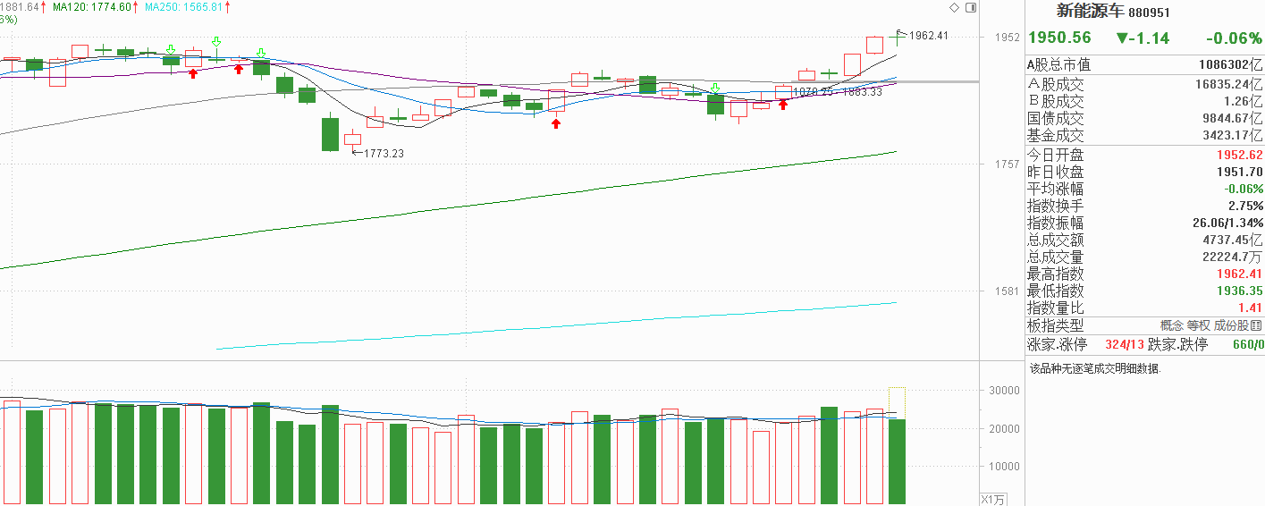 新能源车昨天中阳反弹继续上行,但没有创9月18号的高点,当然,10月以后的高点已经修复,最起码回到9-11月震荡平台是没跑了。连续两天中阳反弹力度比较大,我认为是资金流入的信号。今天新能源车继续冲高是预期内的,能不能突破9月18号高点要看主力的表现。本次新能源车自12月17号起一直同步沪指上涨,沪指今天冲高回落对它有情绪上的影响,在技术走势上看,新能源车连续上涨后离5天线比较远,回踩一下5天线也说得过去。毕竟9-11月新能源车在高位平台震荡市的波动不大,一直沿着5天线走的,如果主力没有打算突破9月高点开启新行情,存量博弈下还是按原来的节奏波动稳一些。由于9-11月平台中位区也在5天线附近,我认为到了5天线附近抛压就会减少,突破不了就继续复制大平台的横盘行情。