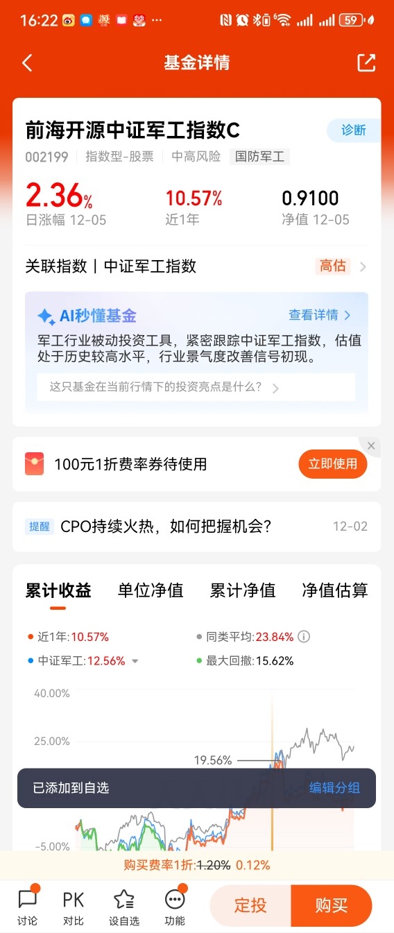# 我与前海开源全家桶的“军工情缘”在前海开源基金产品里,我最偏爱$前海开源中证军工指数基金$,这只产品陪我走过了不少市场波动的日子,也让我对行业主题基金有了更深刻的认知。最初入手是看中军工板块的高景气和强政策属性,2022年市场整体低迷时,军工板块因地缘局势和装备更新需求走出独立行情,这只基金精准跟踪中证军工指数,没有多余的主动择时,让我稳稳吃到了板块红利。2023年板块回调时,我也没着急赎回,因为它的费率在同类指数基金里颇具优势,长期持有成本不高。更让我认可的是,它的持仓聚焦核心军工企业,不蹭热点、不偏离赛道,对于想布局国防军工的普通投资者来说,是性价比极高的工具。如今它依然是我组合里的“硬核配置”,用来对冲消费、科技板块的波动再合适不过。