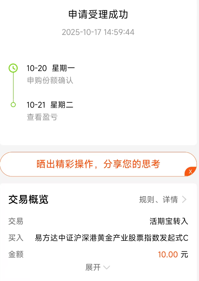 本月以来,黄金又因为持续创新高而进入了大家的视野,近期市场震荡,黄金的避险属性再次凸显,利好金价,从长期来看,美元信用下行也是本轮黄金上涨的重要逻辑,黄金的中长期配置价值依然比较大,今天又加了$易方达中证沪深港黄金产业股票指数发起式C(OTCFUND|021363)$
