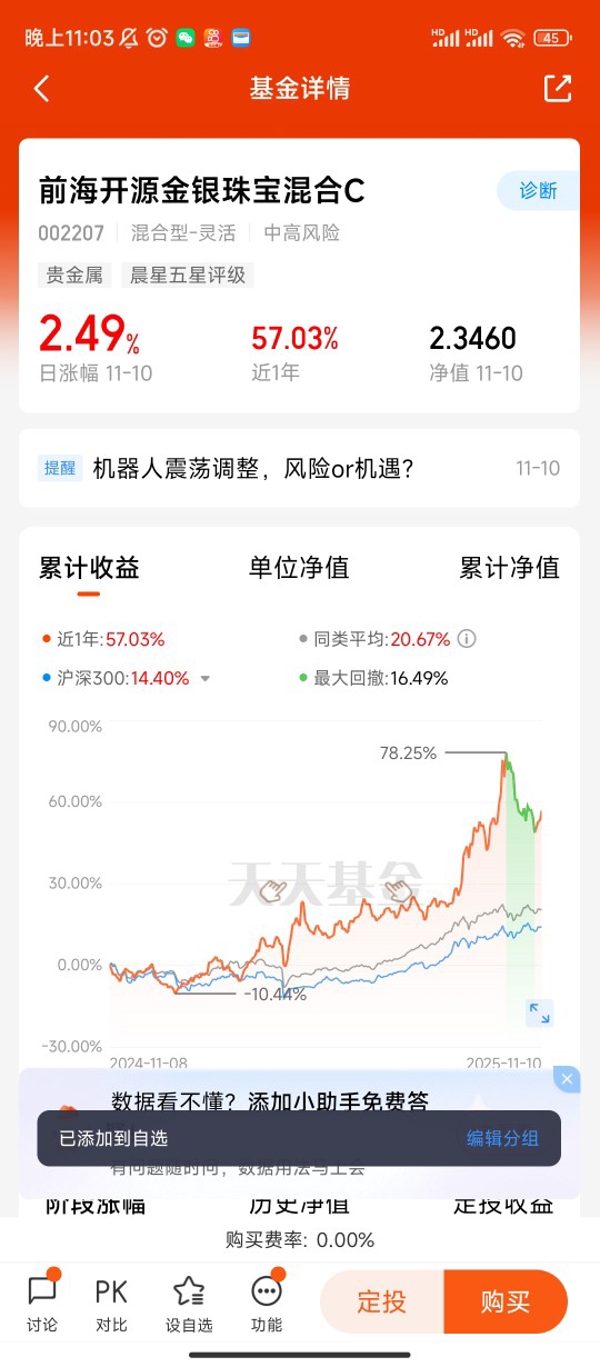 现在全球局势不算稳,黄金本身就有避险属性,而且近一年这只基金涨了57%,长期拿着收益挺可观。它是C类,没有申购费,持有满30天赎回也免费,小额也能买,特别适合普通人。
