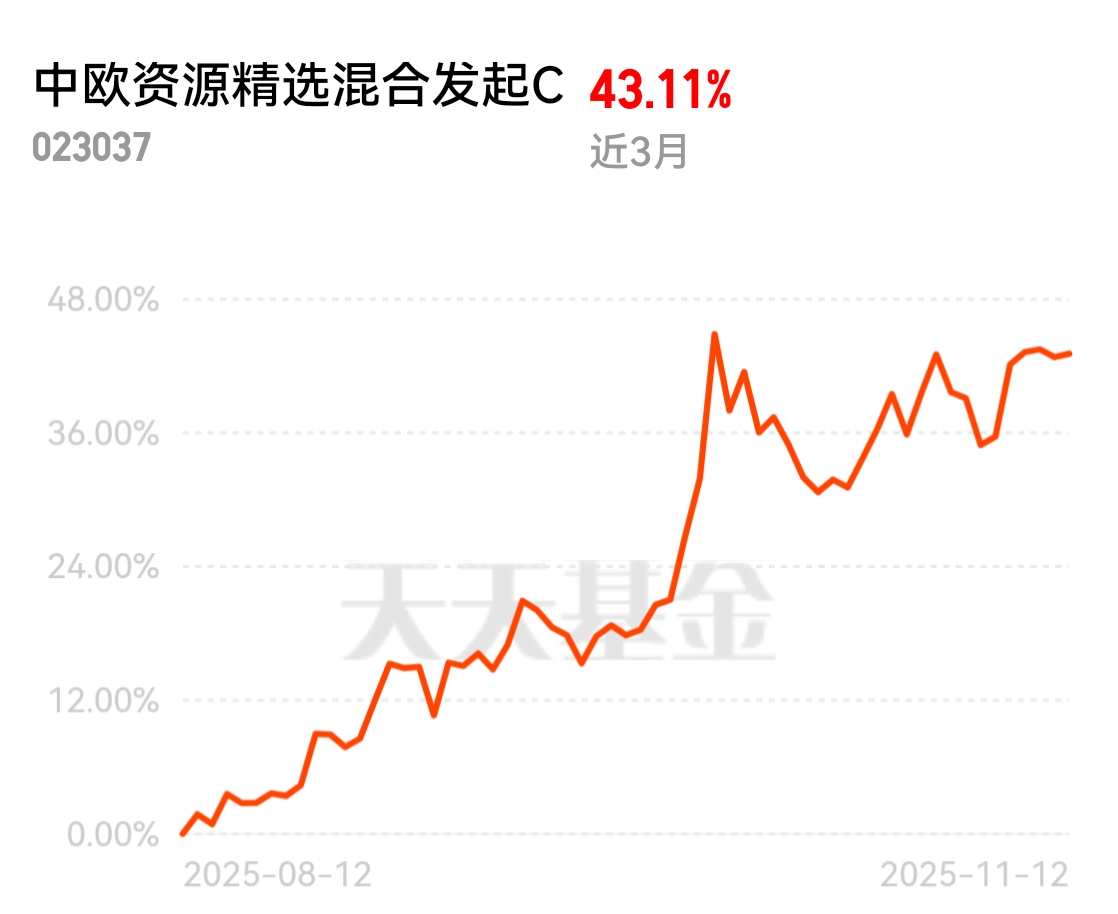市场里能稳稳跟上行情的基金不多,资源类最近真是脱颖而出。中欧资源精选混合C近3个月涨43.11%,走势特别稳。全球央行增持黄金,贵金属行情有支撑,基金布局的龙头企业更有优势,满2万减36加仓红包抓紧用。$中欧资源精选混合发起C$