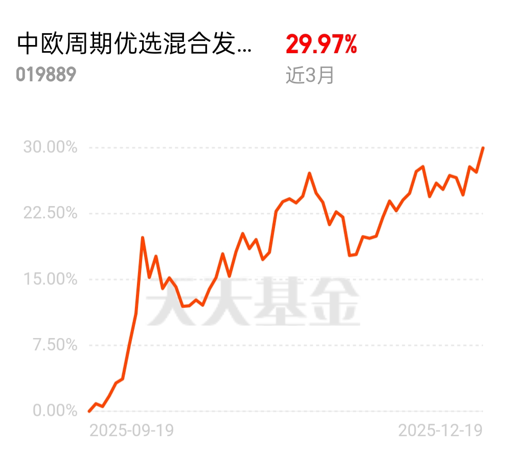 美联储 12 月降息落地,黄金 ETF 持续购金推升金价。这款基金行业集中度高,精准契合周期主线,$中欧周期优选混合发起C$ 近 3 个月 29.97%,同类排名第一,震荡市稳稳盈利。
