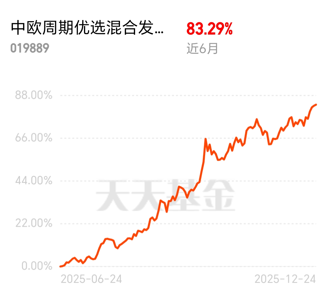 贵金属板块资金持续流入,短期涨势强劲。中欧周期优选混合发起C近6月涨83.29%